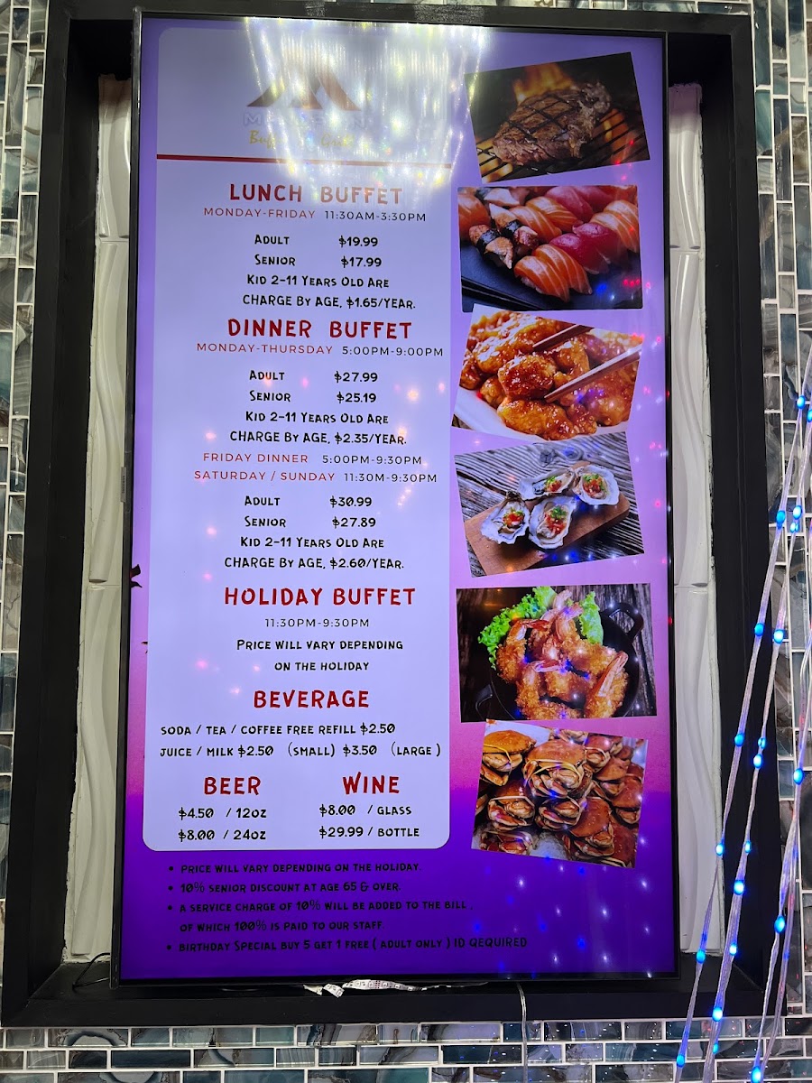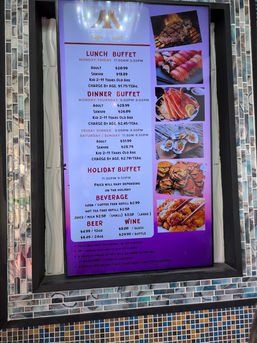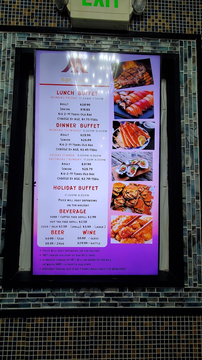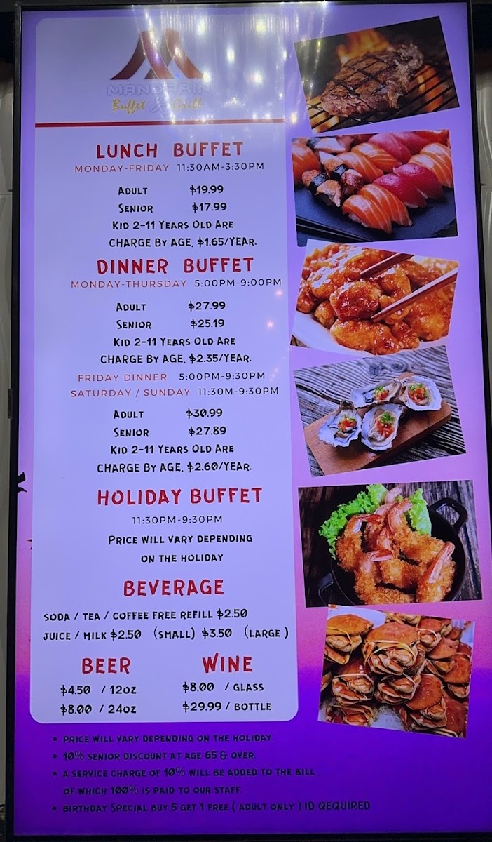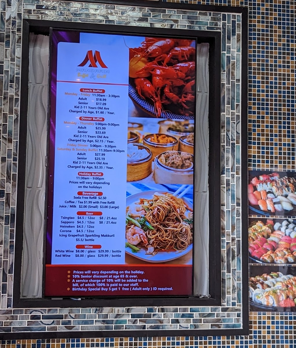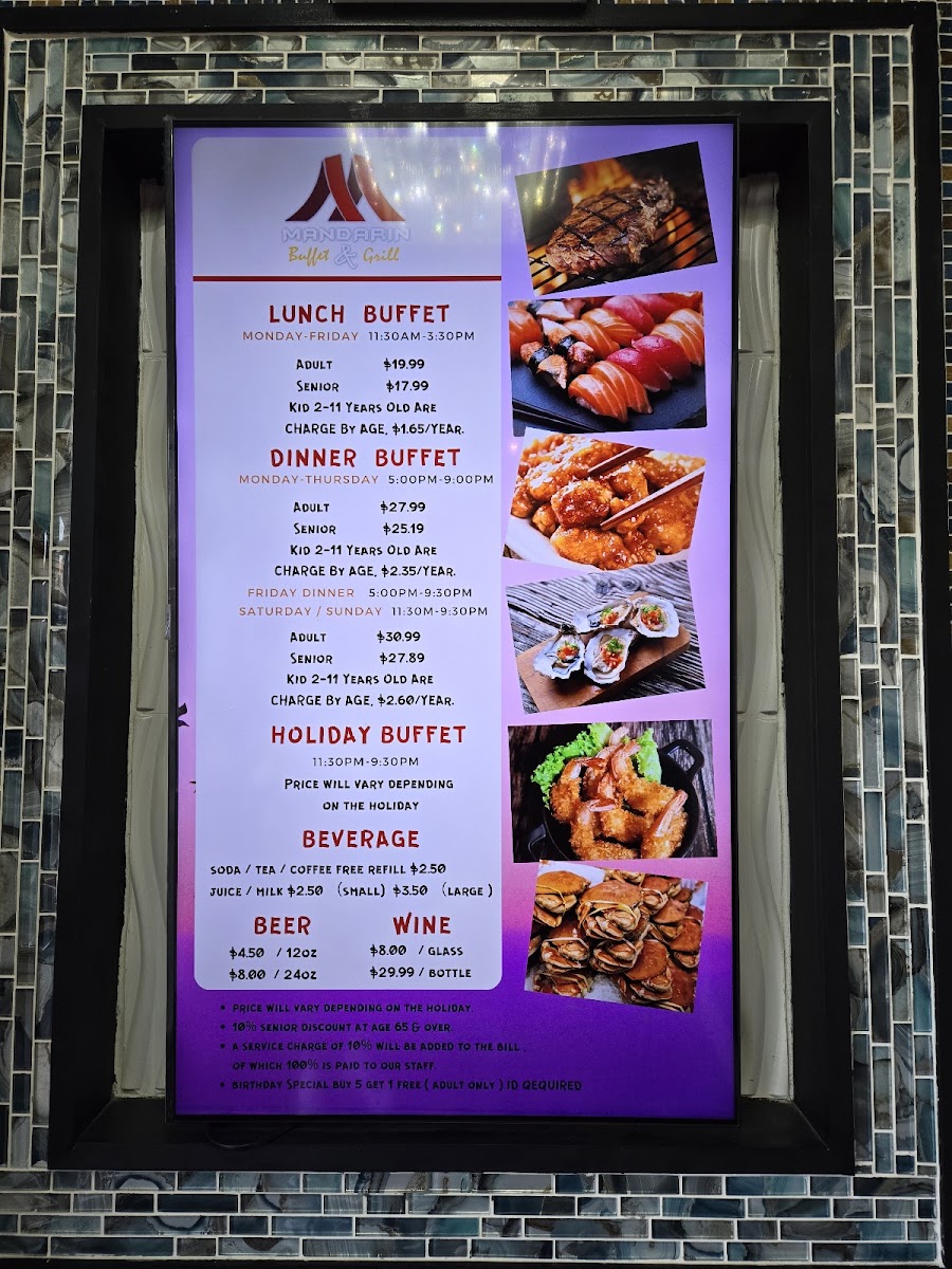 Specializing in Asian cuisine, Mandarin Buffet & Grill prides itself on providing a diverse array of dishes that range from classic Chinese staples to sushi and fresh seafood. For lunch, you can enjoy the buffet from Monday to Friday between 11:30 AM and 3:30 PM, with adult meals priced at $19.99 and seniors at $17.99—a delightful and economical choice to savor a variety of flavors throughout the day. Dinner service runs from 5:00 PM to 9:00 PM (5:00 PM to 9:30 PM on Fridays), with an adult dinner buffet priced at $27.99. On weekends, the buffet is available from 11:30 AM to 9:30 PM for $30.99, making it the perfect destination for family gatherings or casual outings with friends.